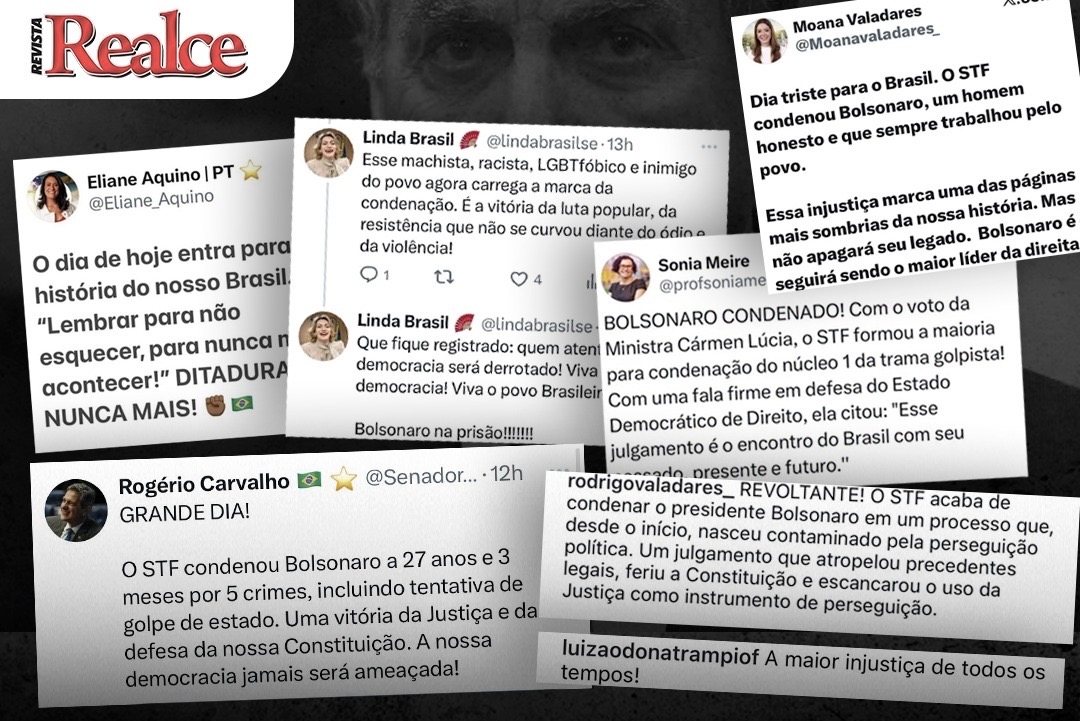Do outro lado, lideranças de esquerda celebraram a condenação. A vereadora e professora Sônia Meire (PSOL) destacou as palavras da ministra Cármen Lúcia em defesa do Estado Democrático de Direito e classificou a decisão como um “encontro do Brasil com seu passado, presente e futuro”. A deputada Linda Brasil (PSOL) também comemorou a “vitória da democracia”, chamando Bolsonaro de “machista, racista e inimigo do povo”, defendendo sua prisão imediata. O senador Rogério Carvalho (PT) publicou que se trata de “um grande dia”, lembrando que Bolsonaro foi condenado a mais de 27 anos de prisão por cinco crimes, incluindo tentativa de golpe de Estado. Eliane Aquino (PT) seguiu no mesmo tom e registrou: “Ditadura nunca mais!”.
